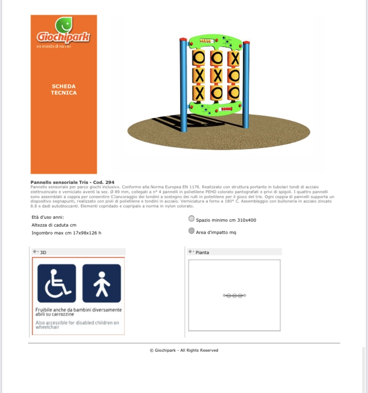 Abbiamo scelto anche giostrine per diversamente abili,  inserita in uno spazio comune, senza barriere, perché lo spirito inclusivo è proprio questo. Putroppo sono ancora pochissimi in Italia i parchi giochi accessibili ai bambini con disabilità sia nelle aree verdi pubbliche sia nelle scuole Con questo nostro impegno intendiamo dare una mano concreta a migliorare la loro vita e la socializzazione”.