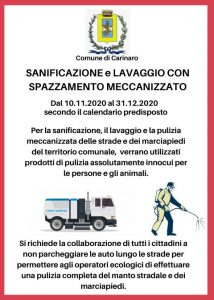 Carinaro-Nell’ottica di interventi programmati per il contrasto e la prevenzione del contagio da Covid-19, l’amministrazione comunale ha predisposto una programmazione di interventi di spazzamento e lavaggio di strade e marciapiedi su TUTTO il territorio comunale.