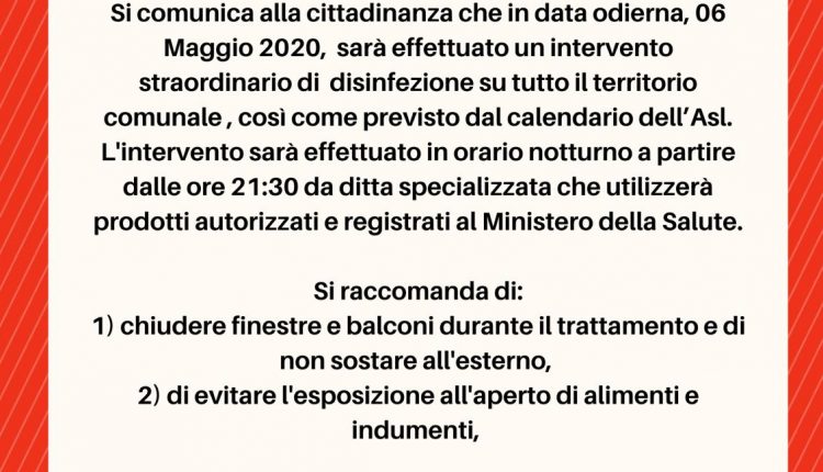 Carinaro-A partire da questa stasera, partirà il primo intervento di deblattizzazione su tutto il territorio comunale secondo il seguente calendario :