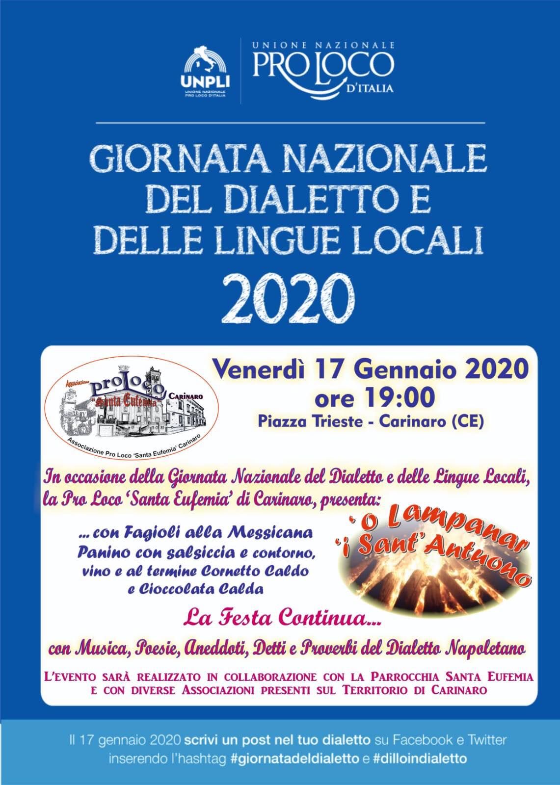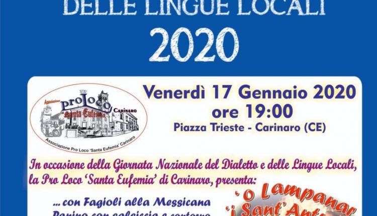 Carinaro– La Pro Loco “S. Eufemia” di Carinaro ,domani venerdì 17 gennaio 2020,celebra la Giornata Nazionale del dialetto e della lingua locale.