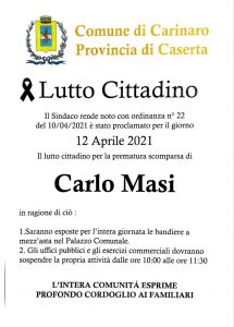 Il comune di Carinaro ha proclamato il LUTTO CITTADINO per lunedì 12 aprile 2021 per la prematura scomparsa di un proprio figlio e per esprimere il più profondo cordoglio alla famiglia Masi di cui Stefano è consigliere comunale e Mario è stato più volte Sindaco.
