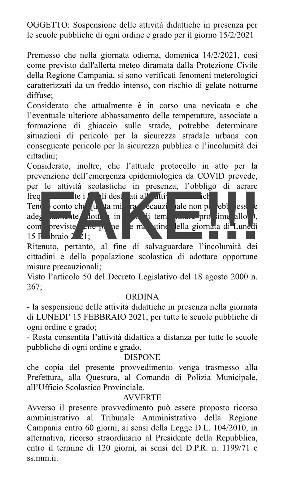 Carinaro- Ordinanza fake sulla chiusura delle scuole