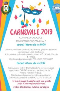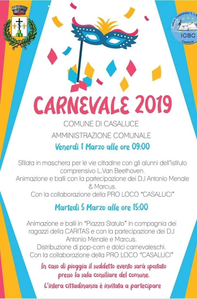 Martedì grasso, 5 marzo, proprio il giorno del Carnevale tutta l’attenzione della popolazione casalucese si sposterà in piazza Statuto. Dalle 15 animazione e balli in compagnia dei ragazzi della Caritas e con la partecipazione dei Dj Antonio Menale e Marcus. E non mancheranno anche le dolci prelibatezze per i più piccoli: saranno distribuiti pop-corn per tutti e tantissimi dolci carnevaleschi. In caso di pioggia questo evento si sposterà in sala consiliare.