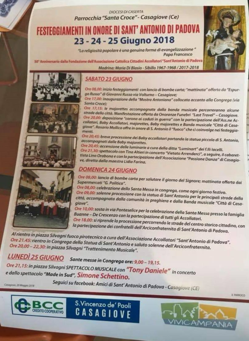 CASAGIOVE – Dal 23 al 25 giugno 2018 la parrocchia “Santo Croce” di Casagiove organizza i festeggiamenti di “Sant’Antonio da Padova”. Tre serate all’insegna del divertimento e della promozione del territorio. In particolare si segnala che il giorno 25 giugno Piazza Silvagni, sede del palco dei festeggiamenti, sarà invasa da una serata organizzata dalla LNP Eventi del cav. Gioacchino Di Lillo. L’evento vedrà due ospiti speciali e tanto amati dal pubblico locale e non solo: Tony Daniele
