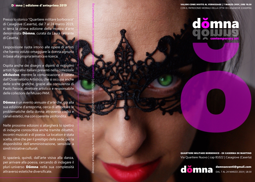 CASAGIOVE – Presso lo storico “Quartiere militare borbonico” di Casagiove (Caserta), dal 7 al 24 marzo 2019, si terrà l’edizione d’anteprima dell’esposizione nazionale d’arte denominata Dŏmna, curata dalla giornalista Laura Ferrante di Caserta. La mostra ruota intono alle opere di artisti che hanno voluto omaggiare la donna ognuno in base alla propria tematica e ricerca. Ospita anche dei disegni e dipinti di notissimi artisti figurativi italiani presenti nella collezione eXclusive, mentre la comunicazione è curata dall’Osservatorio Artistico, che si occupa anche delle scelte grafiche, grazie alla consulenza di Paolo Feroce, direttore artistico e responsabile delle collezioni del Museo PAM. Dŏmna è un evento annuale che, già alla sua edizione d’anteprima, cerca di affrontare le problematiche della donna attraverso l’estetica, ma con estrema profondità e ad ampio raggio.
