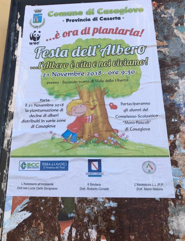CASAGIOVE – L’amministrazione comunale di Casagiove, come ormai di consueto, celebrerà la “Festa dell’albero” il prossimo 21 novembre 2018. “È ora di piantarla…”, questo il nome dell’iniziativa casagiovese all’insegna della difesa della natura e del nostro immenso patrimonio naturale, si svolgerà mercoledì 21 novembre a partire dalle ore 9:30 lungo il secondo tratto di viale della Libertà (di fronte alle piscine). Si tratta di un progetto in itinere che abbraccerà diversi appuntamenti nel corso dell’anno. La manifestazione del 21 sarà solo l’inizio di una serie di interventi che prevedono piantumazioni in diverse zone della città. Ad assistere agli interventi saranno i ragazzi del complesso scolastico “Moro-Pascoli” di Casagiove. La manifestazione è stata fortemente voluta dal Sindaco, Dott. Roberto Corsale, dall’Assessore all’Ambiente, Dott.ssa Lucia Carla Savignano, e dall’Assessore ai Lavori Pubblici, Dott. Mario Melone, in collaborazione con la BCC Terra di Lavoro “San Vincenzo de Paoli”. “Si tratta di un appuntamento” – ha dichiarato l’Assessore Savignano – “che è ormai entrato a far parte del calendario di manifestazioni ed appuntamenti della nostra realtà comunale. La difesa dell’ambiente, soprattutto nei tempi critici in cui viviamo, è sempre più una necessità, un elemento di fondo essenziale per poter sperare in un futuro migliore per i nostri. La presenza e l’impiego dei nostri ragazzi, in questo genere di manifestazione, vuole concretizzare questa nostra idea. Non solo noi, ma soprattutto le nuove generazioni, devono educarsi al rispetto del verde e dell’ambiente in cui viviamo”. Il Sindaco Corsale e gli Assessori Savignano e Melone hanno voluto infine ringraziare per la vicinanza e la disponibilità il Presidente della BCC Terra di Lavoro “San Vincenzo de Paoli”, Dott. Valentino Grant.