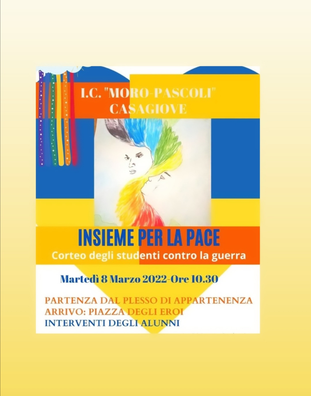 Casagiove. Martedì 8 Marzo, l’Istituto Comprensivo Moro-Pascoli, sotto la guida della Preside Dott.ssa Teresa Luongo, scenderà in Piazza per una manifestazione di solidarietà al Popolo Ucraino, contro la guerra.