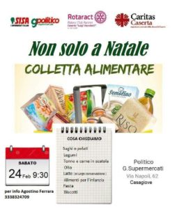 CASERTA – Il Rotatact club Caserta Luigi Vanvitelli in collaborazione con la Caritas diocesana di Caserta, organizza per sabato 24 febbraio la I edizione della Raccolta Alimentare dedicata alle persone meno fortunate.