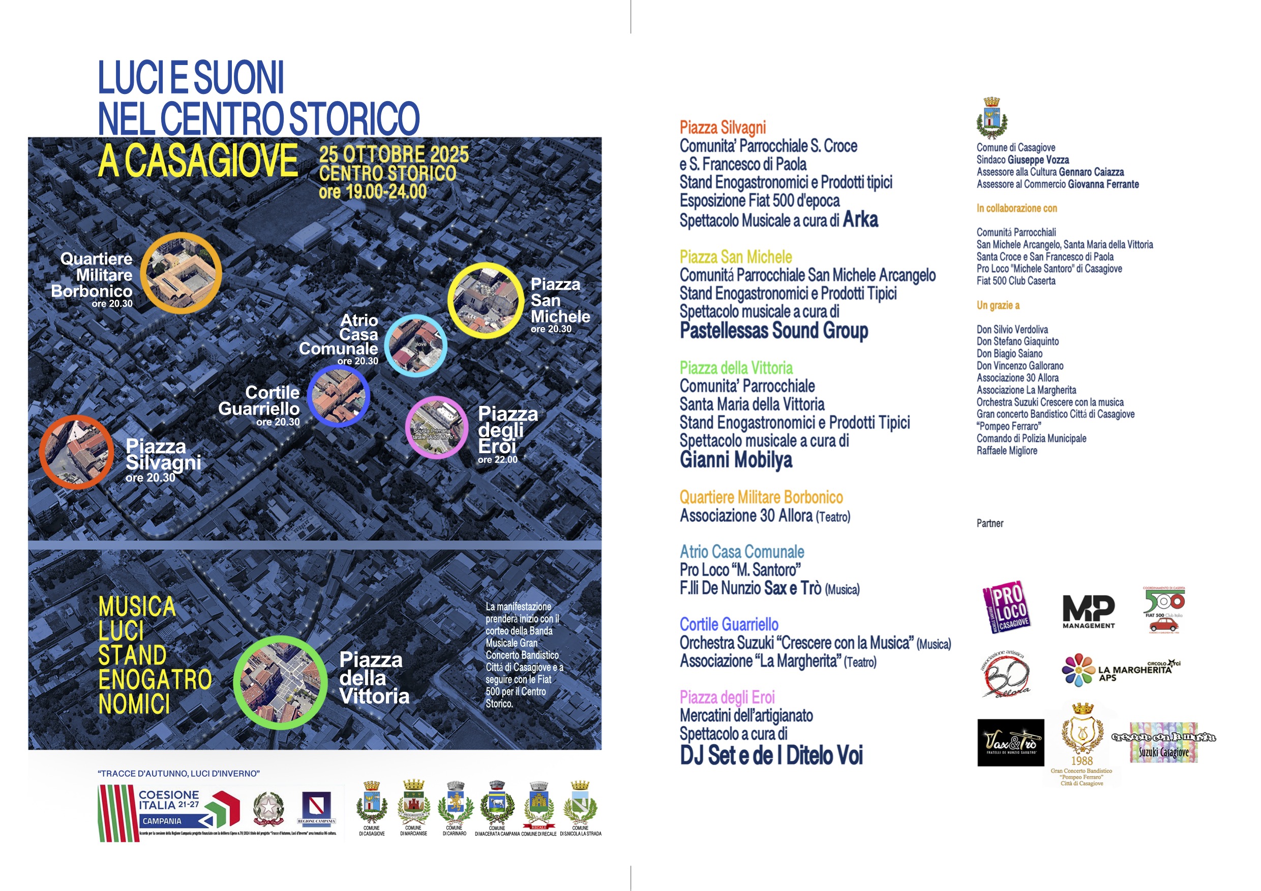 la Notte Bianca di Casagiove “Luci e Suoni nel Centro Storico”, promossa dal Comune di Casagiove, rientra nell’ambito del progetto “Tracce d’Autunno, Luci d’Inverno” – finanziato dalla Regione Campania attraverso l’Accordo per la Coesione (Delibera CIPESS n. 70/2024) – realizzato attraverso la partecipazione congiunta dei Comuni di Carinaro, Casagiove, Macerata Campania, Marcianise (capofila), Recale e San Nicola la Strada.