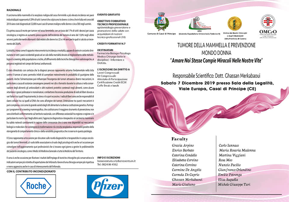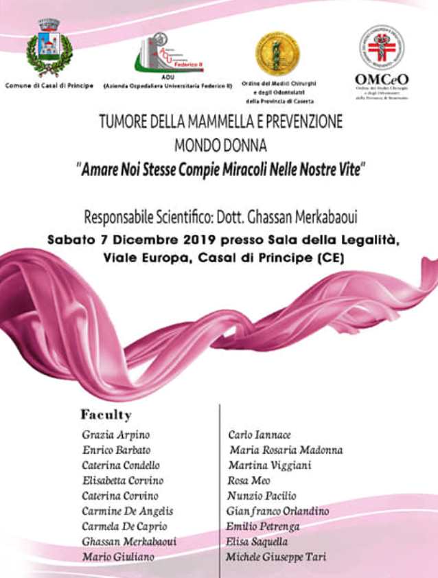 CASAL DI PRINCIPE – Si terrà sabato, 7 dicembre 2019, con inizio alle ore 9:30, presso la Sala della Legalità in Viale Europa a Casal Di Principe (CE), l’evento formativo sul tumore della mammella e la sua prevenzione. Apriranno la giornata con i saluti il Sindaco del Comune di Casal di Principe Renato Franco NATALE, il Direttore Generale dell’ASL CE Ferdinando RUSSO, il Direttore Sanitario del Distretto di Casal di Principe Nicola ANDRIELLA, il Direttore del DAI di Onco-Ematologia A.O.U. Federico II di Napoli Sabino DE PLACIDO, il Vescovo di Aversa S.E.R. Mons. Angelo SPINILLO e il Consigliere dell’Ordine dei Medici Chirurghi e Odontoiatri di CE Raffaele CORVINO.