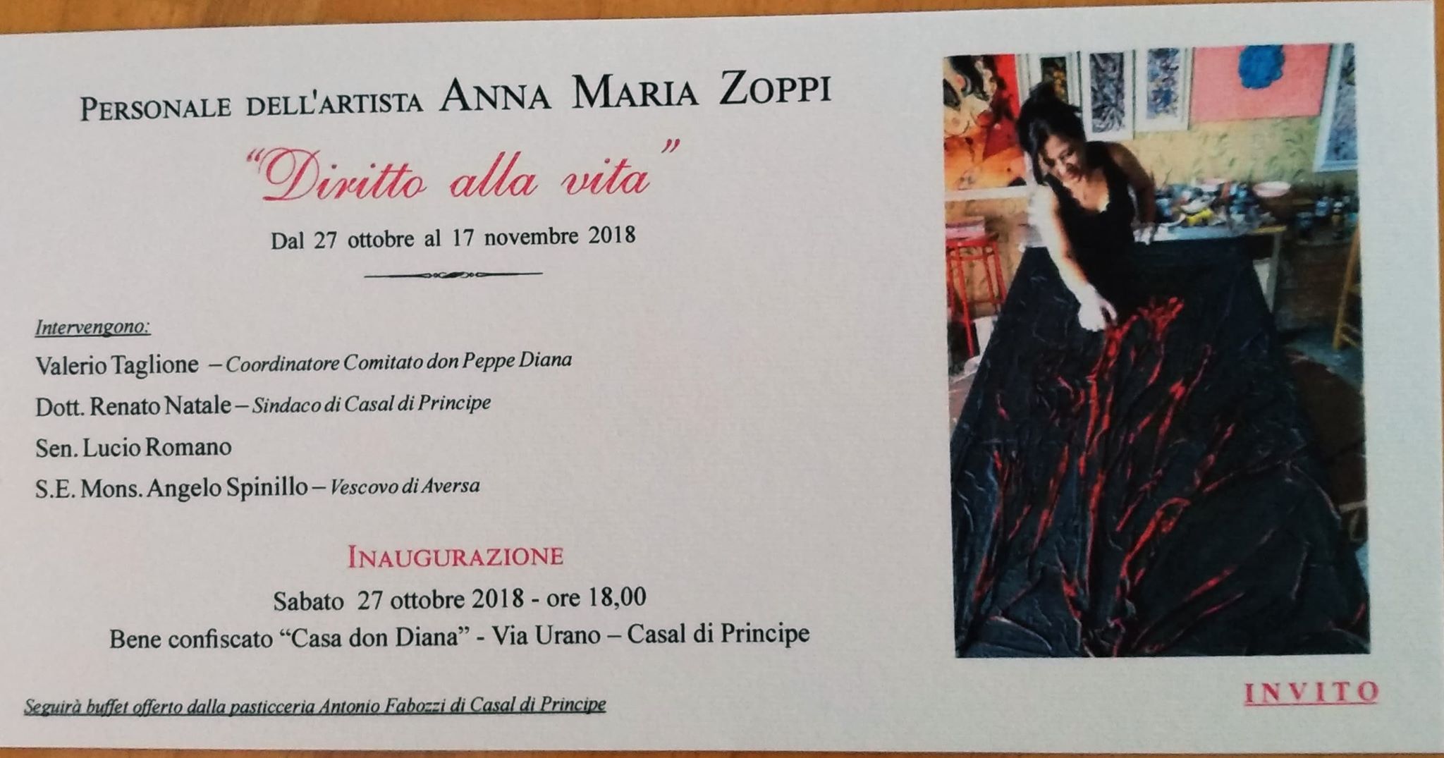 Casal di Principe. ” Diritto alla Vita” : questo il titolo della Mostra Personale allestita dall’Artista di Arti Contemporanee Anna Maria Zoppi e che sara’ inaugurata sabato 27 ottobre 2018 alle ore 18.00 presso il Bene Confiscato ” Casa Don Diana ” in via Urano.
