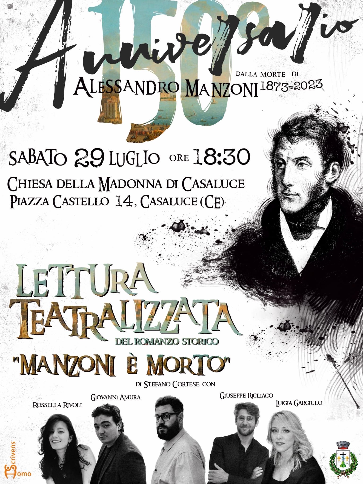 CASALUCE. Sabato 29 luglio 2023, alle ore 18:30, presso la Chiesa della Madonna di Casaluce, si terrà la lettura teatralizzata del romanzo storico “Manzoni è morto” di Stefano Cortese. L’evento è stato organizzato dall’amministrazione comunale in ricorrenza del 150° anniversario dalla morte di Alessandro Manzoni, “allo scopo – spiega l’assessore alla cultura Valentina Sorrentino – di commemorare la figura e l’opera del grande scrittore”.