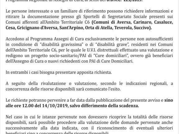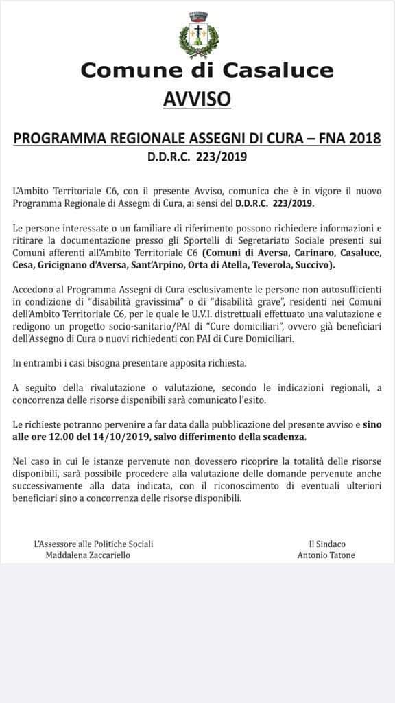 CASALUCE– È stato pubblicato l’Avviso per la presentazione delle istanze di richiesta degli assegni di cura. Per l’ass. Zaccariello questa è “la risposta a chi sostiene che non ci occupiamo dei Casalucesi”. La delegata alle Politiche sociali del Comune di Casaluce, l’Assessore Maddalena Zaccariello era stata , infatti, accusata dalla minoranza ,guidata dal Prof. Antonio Cutillo, di prestare più attenzione agli extracomunitari che ai casalucesi. A tal proposito, riportiamo quanto dichiarato sulla pagina facebook di “Uniti per cambiare” il 4 ottobre.