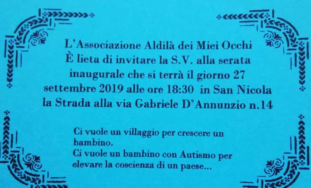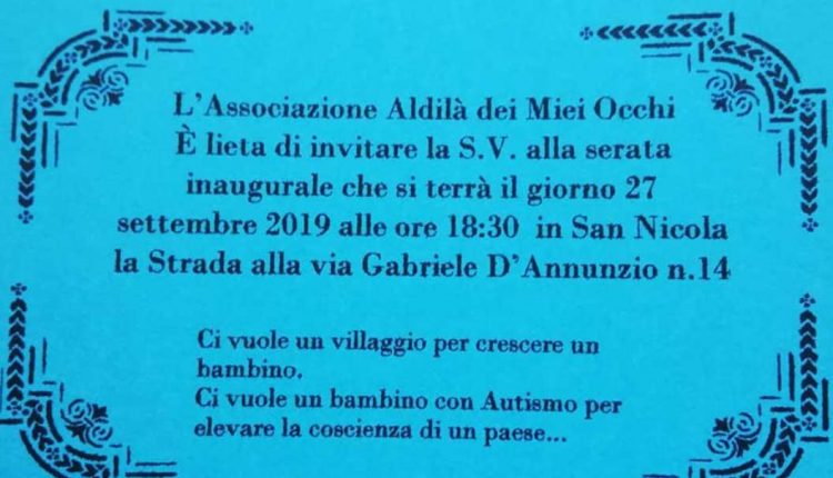 SAN NICOLA LA STRADA – Venerdì 27 settembre 2019, con inizio alle ore 18.30, presso la sede dell’Associazione culturale “Casamore” in via G. D’Annunzio num.14/28 in San Nicola la Strada (CE), sarà presente l’associazione di Curti “Al di là dei miei occhi” che si occupa di bambini affetti dal disturbo dello spettro autistico e disturbi del neuro-sviluppo in età evolutiva. La presidentessa del sodalizio Rachele SIGNORE ha fatto sapere con semplici ma incisive parole che: “…. la nostra realtà associativa nasce dall’esigenza di genitori con figli affetti dallo spettro dell’autismo, per confrontarsi ed aiutarsi a vicenda.