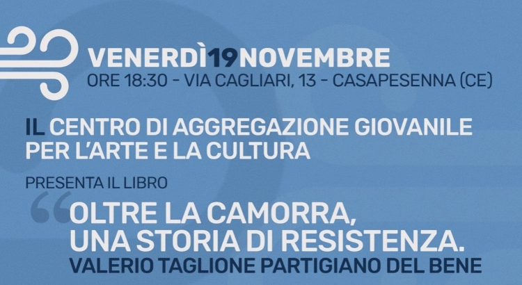 Casapesenna– Venerdì 19 novembre ore 18:30 ArtEspressa, Via Cagliari 13, ci sarà la presentazione del libro “Oltre la camorra, una storia di resistenza. Valerio Taglione partigiano del bene”, di Tina Cioffo ed Alessandra Tommasino Edizioni Città Nuova, 2020.