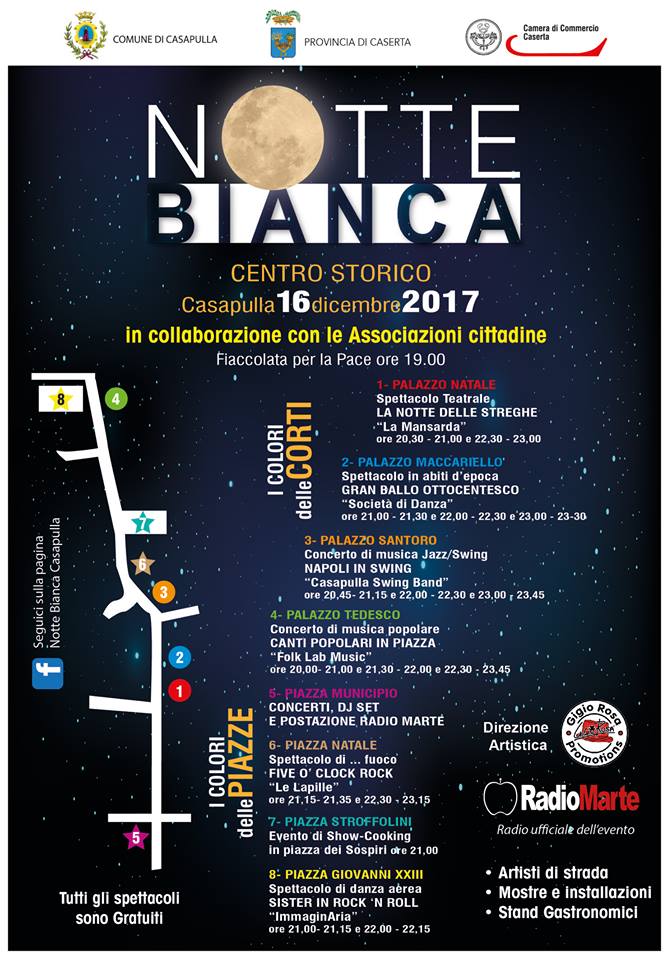CASAPULLA – La notte bianca è un’iniziativa promossa generalmente a livello cittadino, che consiste nell’organizzazione di vari eventi di stampo culturale o di intrattenimento che si svolgono nell’arco di una nottata. Spesso questa è accompagnata dall’allestimento di spettacoli vari e dall’apertura prolungata dei negozi. La prima iniziativa fu creata a Berlino nel 1997 ed a Roma nel 2003. È tutto pronto anche a Casapulla, di cui è Sindaco Michele Sarogni, per il grande evento del weekend quando andrà in scena la “Notte Bianca” per le strade cittadine. La manifestazione, dopo l’enorme successo di dodici mesi fa, quest’anno torna con nuovi spettacoli e nuove location, con in prima linea numerose associazioni cittadine, i commercianti e gli artigiani locali. Novità assoluta dell’edizione 2017 saranno i diversi colori che caratterizzeranno tutto il percorso, creando un’atmosfera suggestiva ed affascinante. Inoltre, si ritorna nel centro storico, dove tutto ebbe inizio e dove le corti e le piazze si animeranno con spettacoli teatrali e musicali, saltimbanchi ed artisti di strada, mostre pittoriche, fotografiche e scultoree, stand gastronomici e di artigianato locale, mentre colori e profumi senza tempo invaderanno le strade. Il contributo di ogni singola Associazione sarà, come nelle scorse edizioni, indispensabile e prezioso, sia nella programmazione dei tanti spettacoli previsti, sia nella realizzazione della serata, con i tanti stand che andranno a collocarsi lungo il percorso e che saranno la cartina di tornasole della ricchezza sociale e culturale di Casapulla. La Direzione artistica è affidata, come nelle due precedenti edizioni, alla Gigio Rosa Promotions. Anche il primo cittadino è entusiasta di questa “Notte Bianca” tanto che sulla propria bacheca ha postato: “È ufficialmente partito il conto alla rovescia per la terza edizione della Notte Bianca di Casapulla” – ha scritto il sindaco Sarogni – “un evento, come ho già avuto modo di affermare, del paese e dei casapullesi. Anche quest’anno i commercianti del centro storico e le tante Associazioni cittadine saranno i reali protagonisti della serata, oltre a tutti coloro che vorranno vivere momenti di spensieratezza e convivialità tra le strade e le piazze di una Casapulla un po’ diversa. Attraverso un percorso che si snoda tra Corti e Piazze illuminate di diversi colori, sarà possibile assistere a spettacoli teatrali, concerti, balli in abiti d’epoca, esibizioni di artisti di strada, spettacoli circensi, mostre, installazioni, mercatini, stand gastronomici ed un grande evento di Showcooking in Piazza dei Sospiri. Vi aspetto sabato 16 dicembre 2017 alla Notte Bianca 2017, per quella che si preannuncia un’edizione speciale e scoppiettante”. Il programma parte alle ore 19.00 con la “Fiaccolata per la Pace” e proseguirà per gli eventi programmati nel “Palazzo Natale”, con lo spettacolo teatrale “La Notte delle Streghe” de “La Mansarda”; nel “Palazzo Maccariello”, con il “Gran Ballo Ottocentesco in abiti d’epoca; nel “Palazzo Santoro”, con spettacoli di musica “”Napoli in Swing” della “Casapulla Swing Band”; nel “Palazzo Tedesco”, con uno spettacolo di musica popolare “Canti Popolari in Piazza” del “Folk Lab Music”; in “Piazza Municipio” con concerti, dj set e postazione di Radio Marte; in “Piazza Natale” con lo spettacolo di fuoco “Five O’ Clock Rock”; in “Piazza Stroffolini” con evento di show cooking in piazza dei Sospiri; in “Piazza Giovanni XXIII^” con lo spettacolo di danza aerea della “Sister in Rock ‘N Roll”. Tutti gli spettacoli sono, ovviamente, gratuiti.