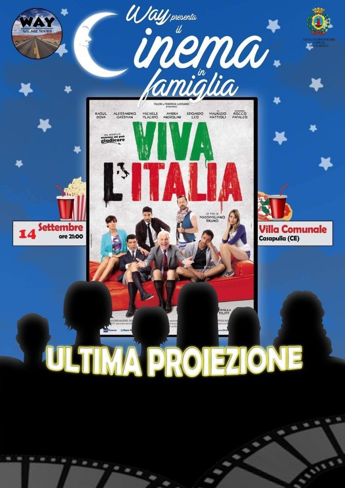 CASAPULLA. Domani sera, 14 settembre, alle ore 21.00 ritorna il <<Cinema In Famiglia>>, ultima proiezione di questa estate promossa dai ragazzi dell’associazione WAY – We Are Young. La pellicola in proiezione, scelta tramite un apposito sondaggio Facebook, sarà <<Viva L’Italia>> del regista Massimiliano Bruno, autore tra tra l’altro di altri Film quali <<Confusi e Felici>>,<<Notte Prima Degli Esami>>,<<Buongiorno Papà>>.