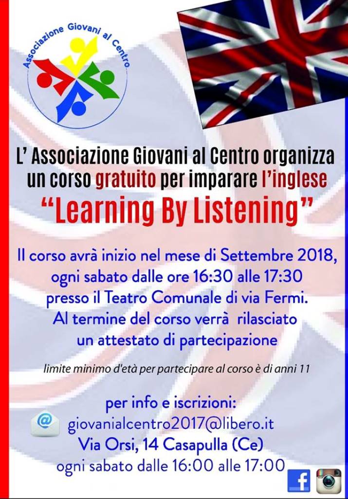 CASAPULLA – Continuano le iniziative dell’associazione “Giovani al Centro” di Casapulla. Dopo le giornate di prevenzione e l’istituzione della card per i soci per usufruire di numerose agevolazioni, adesso i rappresentanti del sodalizio con sede in via Orsi presentano un altro interessante progetto. Si tratta di un corso gratuito d’inglese. “Learning by Listening”