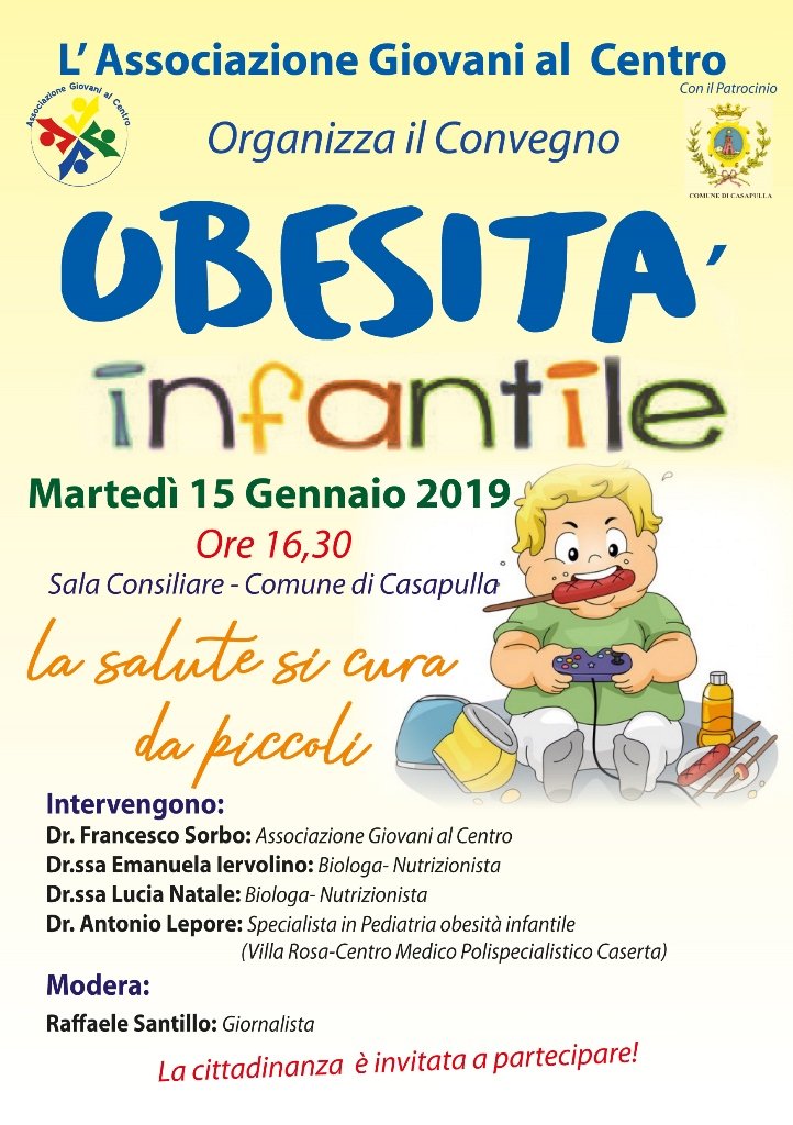 CASAPULLA (Nunzio De Pinto) – L’associazione “Giovani al Centro” ha organizzato un convegno sull’obesità infantile, in programma presso la Sala Consiliare del Comune di Casapulla martedì 15 gennaio 2019, con inizio alle ore 16.30. La manifestazione ha come obiettivo la diminuzione del sovrappeso infantile, diventato uno dei maggiori problemi della sanità pubblica in Italia nonostante il miglioramento registrato degli ultimi dati. La diminuzione del tasso di obesità nei bambini è un segno che le politiche sanitarie messe in atto cominciano a dare i primi risultati.