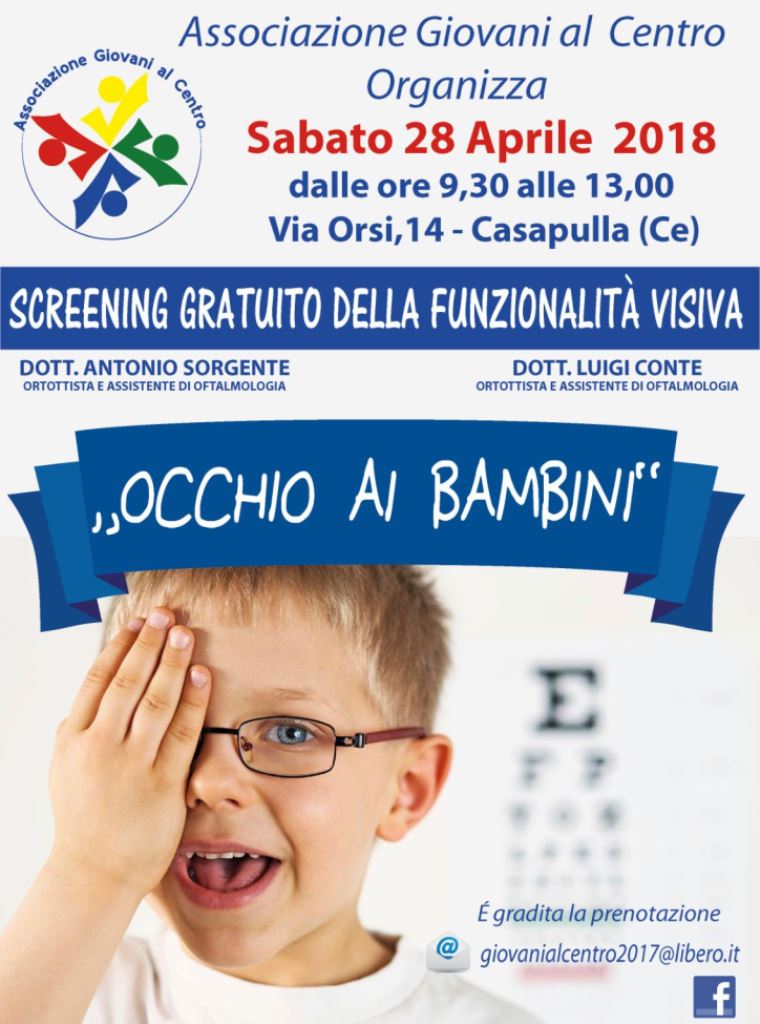 CASAPULLA – Dopo le visite mediche gratuite in occasione della Festa della Donna, la “Pasqua solidale”, con la distribuzione di pacchi a favore delle famiglie meno abbienti, l’associazione “Giovani al Centro” di Casapulla organizza una giornata di prevenzione dedicata ai più piccoli. Sabato 28 aprile 2018, tutti i bambini di età compresa tra 1 e 12 anni, potranno sottoporsi ad uno screening gratuito della funzionalità visiva. Il progetto denominato ‘Occhio ai bambini’ si avvale della qualificata professionalità degli ortottisti e assistenti di oftalmologia Antonio Sorgente e Luigi Conte. Le visite si terranno a partire dalle 9,30 presso la sede del sodalizio “Giovani al Centro” in via Orsi 14 a Casapulla. Tutti coloro che sono interessati potranno prenotare il controllo medico inviando una mail all’indirizzo giovanialcentro2017@libero.it. L’attività della neonata associazione non si ferma qui. Per tutti i soci, infatti, sono previste delle agevolazioni con diversi Enti convenzionati. Inoltre, a partire dal prossimo mese di maggio, sarà attivato lo Sportello Informagiovani; l’obiettivo dei rappresentanti del gruppo di Casapulla é quello di divulgare e far conoscere le tante iniziative e opportunità che sono rivolte ai ragazzi.