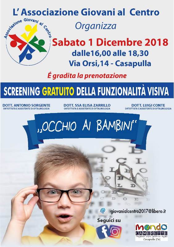 CASAPULLA – Terza giornata di screening gratuito della funzionalità visiva “Occhi ai bambini”, organizzata dall’associazione “Giovani al centro” di Casapulla. Dopo la grande partecipazione agli appuntamenti di aprile ed ottobre e le innumerevoli richieste, i soci del sodalizio con sede in via Orsi hanno deciso di organizzare un’altra giornata dedicata alle visite oculistiche gratuite rivolte ai bambini. I dottori Antonio Sorgente, Elisa Zarrillo e Luigi Conte saranno a Casapulla sabato primo dicembre, dalle 16 alle 18,30, nella sede dell’associazione ‘Giovani al centro’