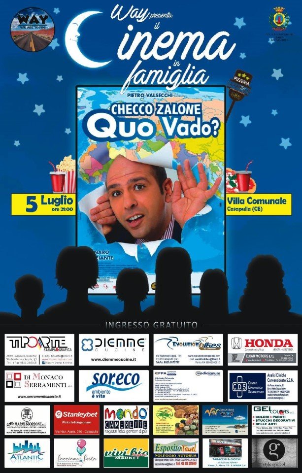 In programmazione una serie di film di grande successo che verranno trasmessi nella Villa comunale di Casapulla a cominciare da mercoledì 5 luglio, con la visione di “Quo Vado?” di Checco Zalone , film adatto ad un vasto pubblico.
