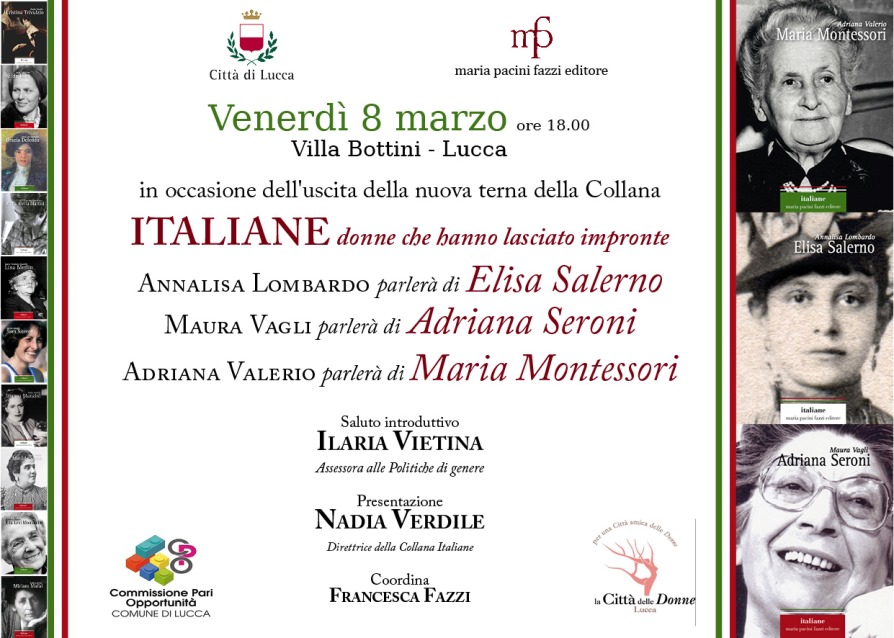 CASERTA – Sarà presentata, in anteprima nazionale, a Villa Bottini a Lucca, venerdì 8 marzo 2019, alle ore 18.00, la nuova terna della Collana “Italiane”, ideata e diretta dalla scrittrice casertana Nadia Verdile, edita da Maria Pacini Fazzi. Tre anni, tredici biografie scritte da penne femminili. Donne che raccontano le donne. L’evento, nella Giornata internazionale della donna, è realizzato in collaborazione con l’assessorato alle pari opportunità del Comune di Lucca, la commissione pari opportunità, e La Città delle donne. Maria Montessori, Adriana Seroni ed Elisa Salerno le tre nuove biografie.