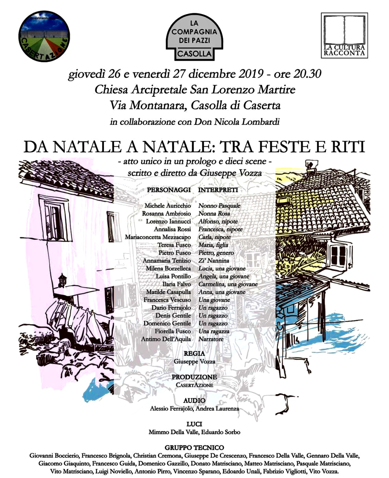 La commedia è stata allestita per martedì 26 e mercoledì 27 dicembre con inizio alle 20.30 nella Chiesa Arcipretale di San Lorenzo di Casolla. L’evento si deve alle due associazioni culturali “CasertAzione” e “La cultura racconta” che hanno dato luogo a “La Compagnia dei Pazzi”. Don Nicola Lombardi, parroco di San Lorenzo, ha voluto ospitare la manifestazione per dare maggiore possibilità alla compagnia di attori, i quali sono tutti del luogo, così come i tecnici.