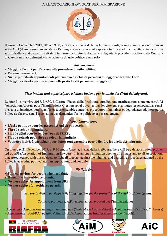 Ad oggi, anche altre associazioni hanno deciso di aderire e fornire tutto il proprio appoggio ad A.P.I. per la realizzazione del sit in del prossimo 21 novembre, tra l altre l’Associazione Biafra, l’Associazione AIM ed il Centro Fernandes.