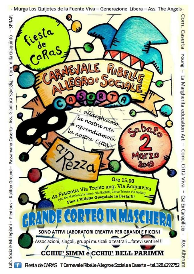 La forza del Carnevale Sociale risiede nella partecipazione di tutte e tutti! Passate parola! Invitate parenti, vicini, amici! I comitati, gruppi, singoli e associazioni che hanno dato luogo a questa magia sono: Murga Los Quijotes della Fuente Viva, Generazione Libera, Comitato Caserta Young, La Margherita, Ass.ne Gianluca Sgueglia, Comitato Città Viva, Centro sociale Ex-Canapificio Kalifoo Ground, Laboratorio sociale Millepiani, Comitato Villa Giaquinto; Piedibus, Andrea Coringa Parea e Michela Bruno Passamano, Associazione Alterum, Associazione The Angels. Il programma e il percorso: Sabato, 01.03.19, vi aspettiamo tutte e tutti in via Acquaviva (angolo via Trento) alle ore 15:00 dove ci sarà il concentramento. Il corteo proseguirà per via de Martino, via Verdi, via Napoli, via Unità Italiana ed entrerà in Corso Trieste per poi proseguire verso via Galilei e concludersi in Villetta Giaquinto alle 18:00!