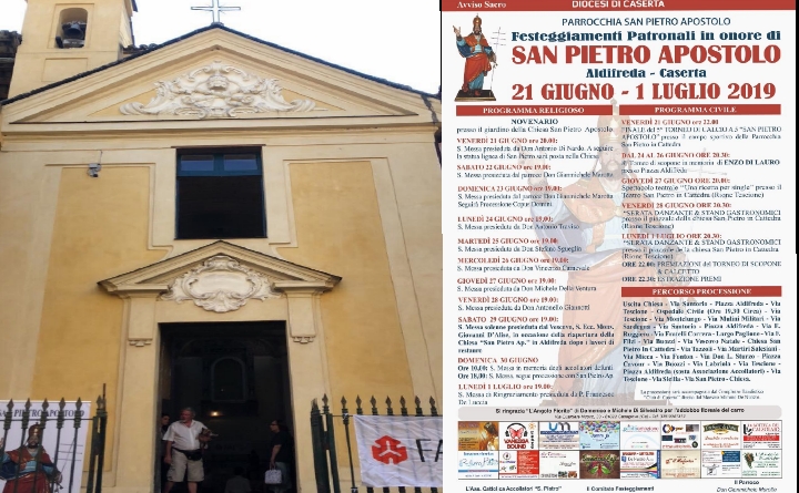CASERTA – Sono passati oltre 14 anni dall’inizio dei lavori di rifacimento della parrocchia di Aldifreda, voluto fortemente dall’allora parroco Frate Crescenzo Rauccio per motivi legati all’umidità che persisteva all’interno dell’edificio. Iniziati nel 2005 hanno portato alla luce fin da subito reperti storici eccezionali, testimonianza della longevità della frazione e della parrocchia. A fare cornice di questa fantastica parrocchia l’antica ed altrettanto spettacolare statua lignea del santo principe degli Apostoli Pietro, venerato da oltre quattrocento anni. Tradizione che permane nel tempo ed ha ben strette le sue radici, nonostante gli anni passati ad aspettare la conclusione dei lavori di restauro. Lo scorso 9 giugno con l’alzabandiera e la Peregrinatio del Santo alla vicina parrocchia del Rione Tescione sono ufficialmente iniziati i solenni festeggiamenti. La statua, dopo aver sostato nella chiesa di San Pietro in Cattedra per 12 giorni, venerdì 21 giugno sarà riportata nella sua sede storica di Via San Pietro, appuntamento quindi per i soci accollatori in divisa alle ore 18.30 presso l’associazione, sita in Piazza Aldifreda, raggiungeranno così la Chiesa di San Pietro in Cattedra accompagnati dal Complesso Bandistico “Città di Caserta” e la confraternita Sant’Antonio da Padova di San Benedetto (CE). Alle ore 20.00 la celebrazione della Santa Messa sancirà l’inizio del Novenario. Al termine della messa, la statua sarà posta in Chiesa.