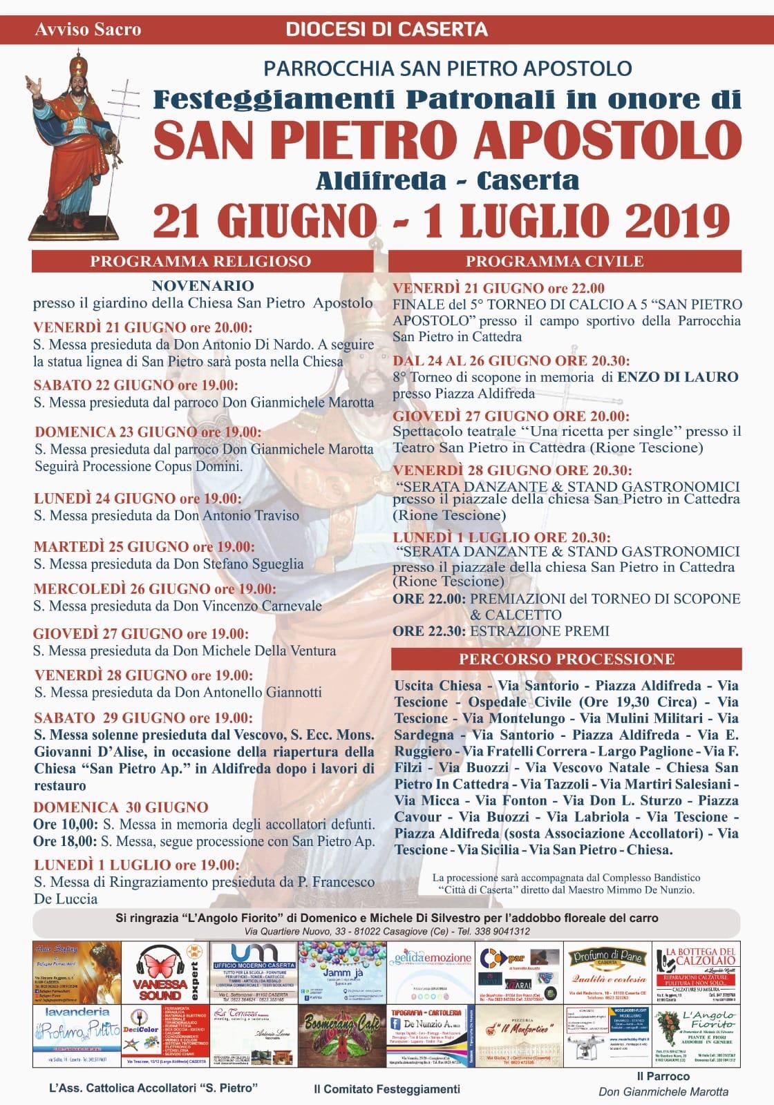 Tutto pronto quindi per il giorno 29 Giugno, giorno principale dei festeggiamenti avrà luogo una messa solenne alle ore 19:00 presieduta da S.E. Mons. Giovanni D’Alise Vescovo di Caserta in cui si benedirà l’altare ed aperta ufficialmente la parrocchia.