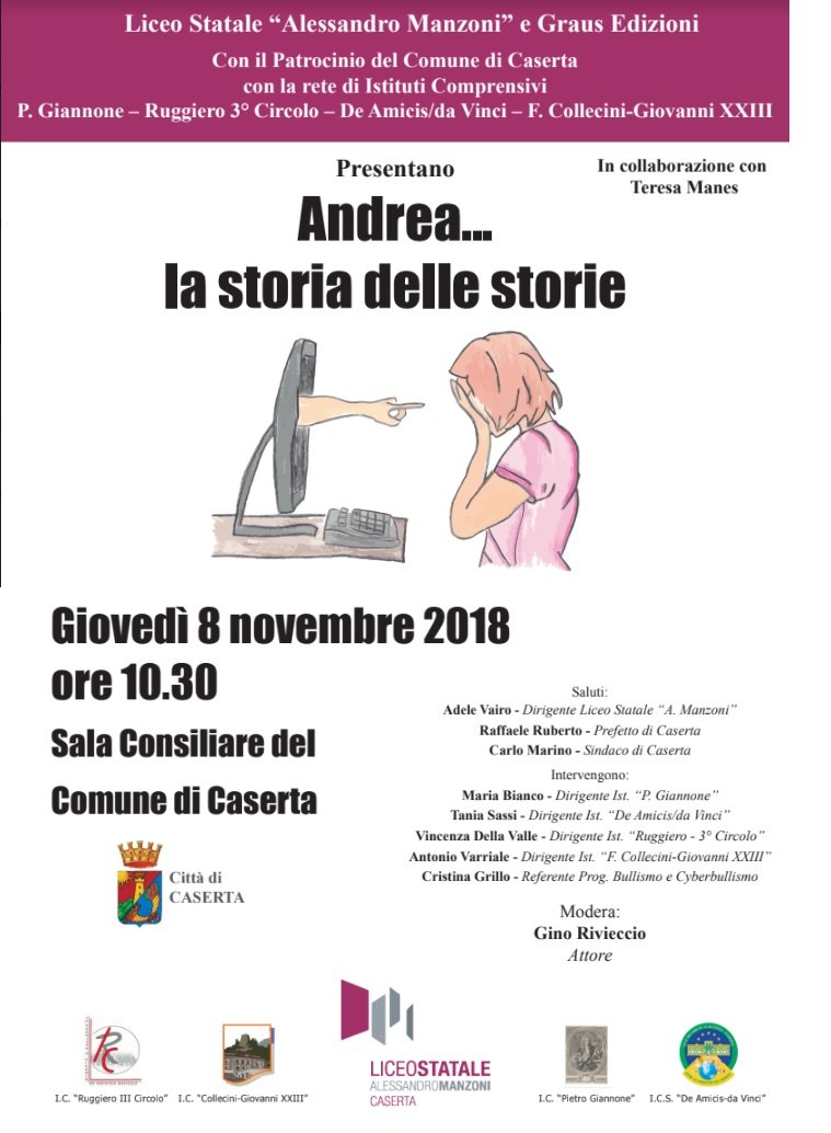 CASERTA – Giovedì 8 novembre 2018 alle ore 10,30 nella Sala Consiliare del Comune di Caserta il Liceo Statale “A. Manzoni” con la rete di Istituti Comprensivi “P.Giannone”, “Ruggiero – III Circolo”, “De Amicis/da Vinci”, “F.Collecini – Giovanni XXIII”, con il patrocinio del Comune di Caserta, presentano il libro “Andrea…la storia delle storie” (Graus Edizioni), una raccolta dei tempi svolti dai ragazzi di tutti gli istituti coinvolti nel Progetto “Bullismo e Cyberbullismo”, temi che ruotano intorno ai ricordi di un uomo, marito e padre legati da un unico filo conduttore.