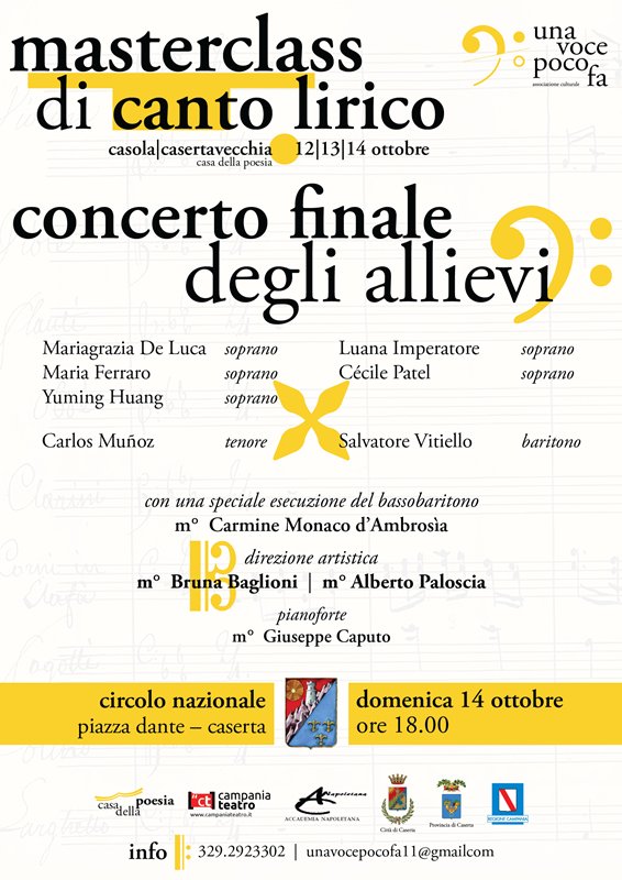 CASERTA – Tre giorni di alta formazione musicale, due maestri d’eccezione, un manager artistico di caratura internazionale e dieci allievi cantanti lirici provenienti da tutta Europa. Sono i numeri della Masterclass di Canto Lirico organizzata nel quartiere Casertavecchia da venerdì scorso, e fino a domenica 14 ottobre 2018, dall’associazione “Una voce poco fa” presso la storica residenza della Casa della Poesia a Casola di Caserta . L’iniziativa – realizzata in collaborazione con Campania Teatro e sotto il patrocinio di Città di Caserta, Provincia di Caserta e Regione Campania – ha inteso realizzare, nell’unico capoluogo di provincia campano privo di Conservatorio, un’occasione di alta formazione artistica con docenti di caratura internazionale che hanno offrendo non solo una occasione di grande formazione accademica ma una vera opportunità di crescita umana e professionale. Due i laboratori attivati dalla Masterclass. Il laboratorio di tecnica vocale è stato affidato a Bruna Baglioni, mezzosoprano di straordinaria esperienza, che ha calcato nella sua carriera i più importanti palchi mondiali, e docente internazionale di tecnica vocale. Il laboratorio di interpretazione è stato, invece, affidato ad Alberto Paloscia, musicologo, organizzatore musicale e regista, dal 1990 direttore artistico del Teatro Goldoni di Livorno. Una speciale partecipazione è data dalla presenza del manager artistico internazionale Priscilla Baglioni, che è stato presente alle lezioni durante tutte le giornate di formazione. Il coordinamento didattico dell’evento è stato affidato al bassobaritono di caratura internazionale Carmine Monaco d’Ambrosìa. “Essere riusciti a realizzare un evento di alta formazione musicale a Casertavecchia è per noi un sogno che si avvera” – dichiara Rosa Casella, presidente dell’Associazione Una voce poco fa – “ed il risultato di tanto lavoro e tanto impegno profusi in questi mesi. È per noi un onore avere avuto la possibilità di riunire tanti docenti di tale caratura a e tanti allievi provenienti da tutti Europa”. “È per me un piacere essere qui a Caserta in occasione di questa Masterclass” – dichiara Carlos Muñoz, tenore colombiano, fondatore e direttore della Òpera Jove de Catalunya – “non solo per il grande valore accademico dei maestri Baglioni e Paloscia ma per la splendida occasione che è stata data a noi allievi di visitare questi splendidi luoghi”. A conclusione dei tre giorni di formazione vi sarà uno speciale concerto finale, questa sera alle 18.30 presso il Circolo Nazionale di Caserta, con performance di tutti gli allievi e del m° Carmine Monaco d’Ambrosìa accompagnati al pianoforte dal m° Giuseppe Caputo.