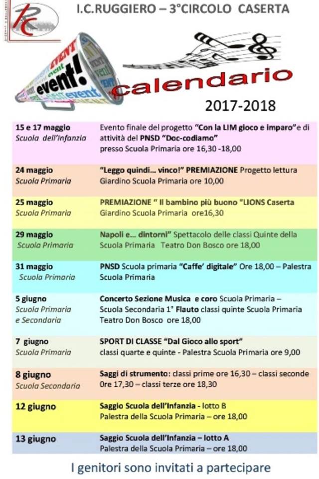 , di cui è dirigente scolastica la professoressa Vincenza Della Valle, i cui docenti hanno preparato i saggi natalizia. Nell’occasione delle prossime festività estive un sincero augurio va a tutti gli alunni affinché vivano questo periodo di vacanze estive all’insegna dell’amore, del bene, della tolleranza, del rispetto altrui. Ai genitori, invece, va il ringraziamento per l’apporto culturale e la disponibilità e la collaborazione nei riguardi della Istituzione scolastica. Ai Docenti ed a tutto il Personale l’augurio di continuare a svolgere con dedizione e professionalità il ruolo determinante per la formazione degli alunni perchè la scuola divenga sempre più palestra di vita. Le iniziative che condurranno gli studenti dell’Istituto Comprensivo “Ruggiero – 3° Circolo Caserta” alle tanto agognate vacanze sono iniziate il 15 e 17 maggio con la Scuola dell’Infanzia che ha concluso l’evento finale relativo al Progetto “Con la LIM Gioco e imparo” e dell’attività del PNSD “Doc-codiamo”. Il 24 maggio 2018 si svolgerà, alle ore 10.00, presso la Scuola primaria, la Premiazione del Progetto “Leggo quindi….. vinco”. Il 25 maggio, sempre nella scuola primaria alle ore 16.30, si svolgerà la premiazione “Il bambino più buono” Lions Caserta. Il giorno 29 maggio, presso il Teatro Don Bosco, con inizio alle ore 18.00, con la partecipazione delle classi quinte della scuola primaria si svolgerà lo spettacolo dal titolo: “Napoli e…… dintorni”. Il 31 maggio, alle ore 18.00, nella palestra della scuola primaria PNSD si terrà “Caffè digitale”. Il 5 giugno 2018, sempre presso il Teatro Don Bosco, con inizio alle ore 18.00, si terrà un grande Concerto della Sezione Musica e coro scuola primaria e secondaria 1° Flauto classi quinte della scuola primaria. Il successivo 7 giugno, invece, un evento sportivo dal titolo: “Dal Gioco allo Sport” che vedrà coinvolti, alle ore 9.00, le classi quarte e quinte della scuola primaria all’interno della palestra. L’8 giugno nuovi eventi musicali nella scuola secondaria che vedranno partecipare ai saggi di strumento, alle ore 16.39 gli alunni della classi prime, alle ore 17.30 quelli delle seconde classi e, infine, alle ore 18.30 gli studenti delle terze classi. Il 12 giugno si svolgerà, alle ore 18.00 nella palestra della scuola primaria, il saggio finale della scuola dell’infanzia – lotto B. Infine, il giorno 13 giugno 2018, nella palestra della scuola primaria, si terrà il saggio finale della scuola dell’infanzia – lotto A. A scuola tutto ci parla delle attività di fine anno scolastico: canti, poesie e recite, musica, momenti solidarietà, dove il bambino è il protagonista principale: insieme ai suoi compagni prepara gli addobbi, i doni, e si impegna nell’imparare i canti e gli strumenti musicali. Ai docenti è toccato il compito di creare un ambiente ricco di armonia ,di emozioni, di empatia, di condivisione e collaborazione, di attenzione agli altri. Anche quest’anno l’Istituto Comprensivo “RUGGIERO – 3° Circolo Caserta” ha raggiunto le mete generali fissate nel POF, grazie alla professionalità dei docenti , dei collaboratori scolastici e del personale di segreteria ed alle risorse umane messe a disposizione da enti e associazioni del territorio a seguito di convenzioni, contratti e intese. I progetti realizzati si sono rivelati rispondenti ai bisogni formativi generali e/o a particolari esigenze di gruppi di alunni o specifici interessi emergenti delle singole classi. Ogni classe, dalla scuola dell’infanzia alla scuola media, ha potuto fruire di una diversificata offerta formativa con almeno un progetto che ha arricchito di contenuti la programmazione, ha favorito il recupero e/o il potenziamento ed ha permesso l’acquisizione di competenze trasversali e interdisciplinari.
