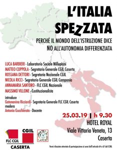 A “L’Italia spezzata. Perchéé il mondo dell’Istruzione dice NO all’autonomia differenziata”, con la Cgil di Caserta, parteciperanno esponenti delle associazioni e giuristi, tra cui il costituzionalista Massimo Villone, e alcuni tra i massimi esponenti nazionali del sindacato, tra cui Annamaria Santoro (Flc Cgil Nazionale) e Rossana Dettori (Segretaria Nazionale Cgil).