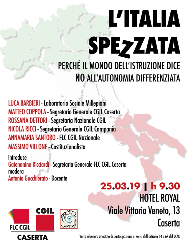 A “L’Italia spezzata. Perchéé il mondo dell’Istruzione dice NO all’autonomia differenziata”, con la Cgil di Caserta, parteciperanno esponenti delle associazioni e giuristi, tra cui il costituzionalista Massimo Villone, e alcuni tra i massimi esponenti nazionali del sindacato, tra cui Annamaria Santoro (Flc Cgil Nazionale) e Rossana Dettori (Segretaria Nazionale Cgil).