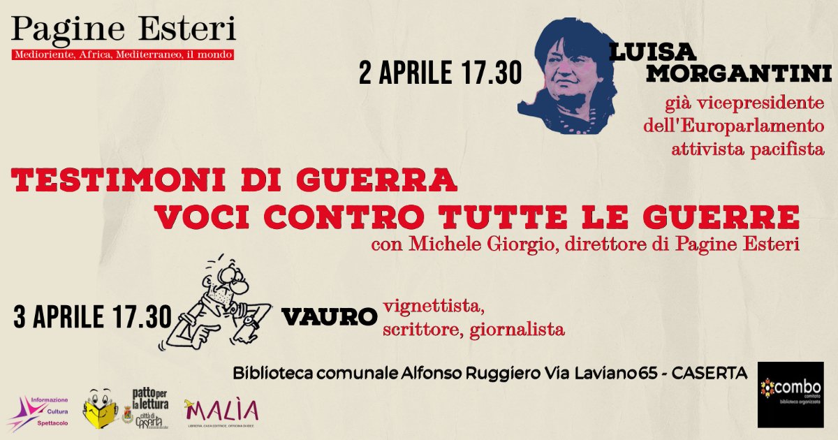 Insieme al direttore Michele Giorgio, all’interno del Patto per la lettura della Città di Caserta e in collaborazione con COMBO – Comitato Biblioteca Organizzata, sabato 2 aprile e domenica 3, nella Biblioteca Comunale “Alfonso Ruggiero“ di via Laviano, accoglieremo due ospiti di eccezione che ci racconteranno le esperienze e l’impegno sociale e professionale contro le guerre e a favore della pace.