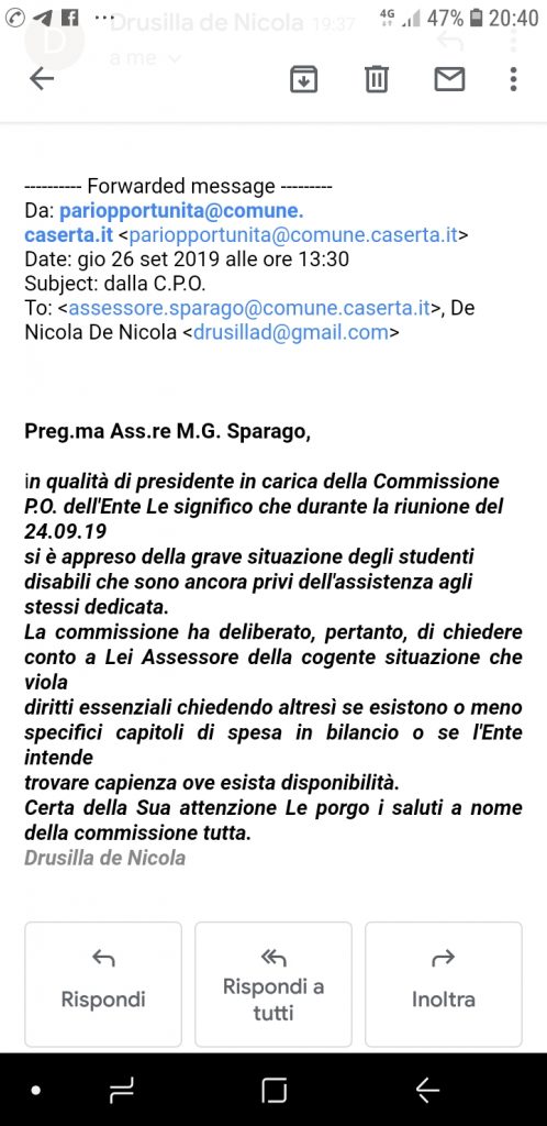 Fin qui tutto bene se non fosse che Maria Giovanna Sparago, da noi intervistata, aveva prima dichiarato di essere al lavoro per garantire l’assistenza scolastica agli alunni diversamente abili e, successivamente, aveva affermato di non avere ricevuto alcuna sollecitazione dalla Commissione Pari Opportunità.