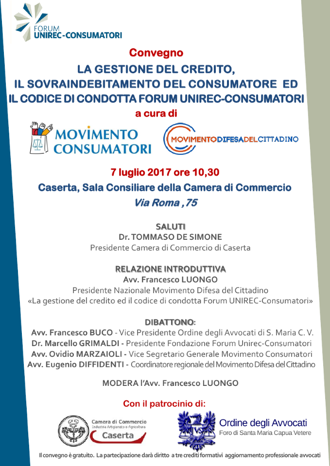 consumatore e il Codice di Condotta FORUM UNIREC-CONSUMATORI”, organizzato dal FORUM UNIREC-CONSUMATORI con il Movimento Consumatori e il Movimento Difesa del Cittadino.