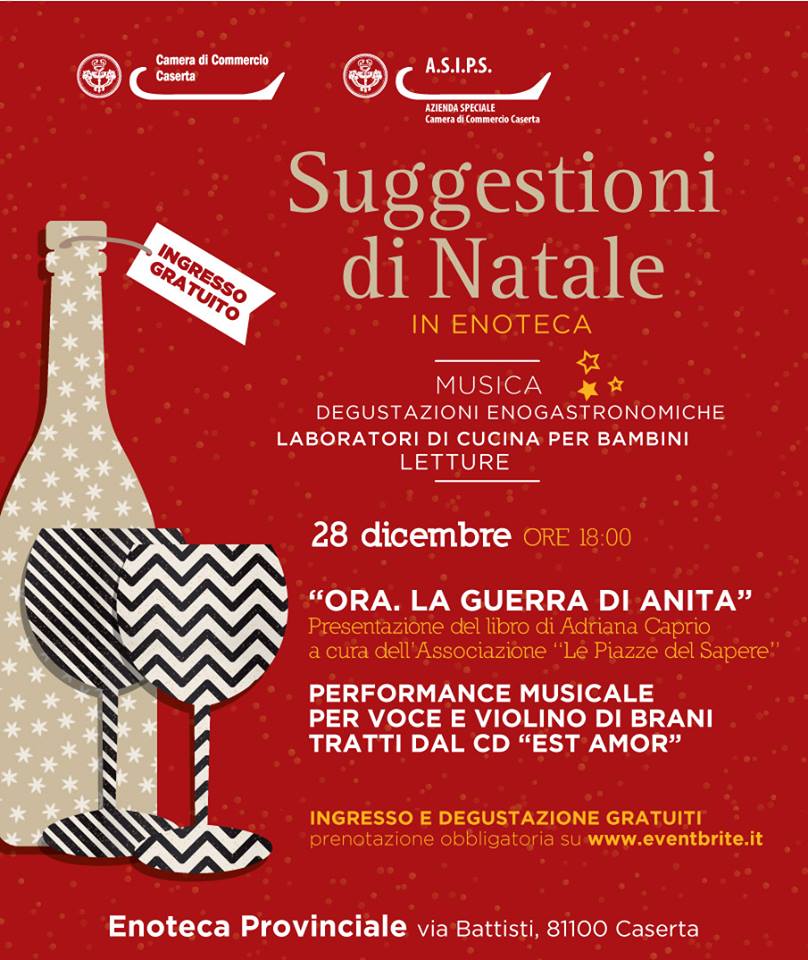 Titolo dell’evento e’ per l’appunto ” Suggestioni di Natale in Enoteca ” con musica, degustazioni enogastronomiche , laboratori di cucina per bambini, letture, e, per l’occasione, l’Associazione  ” Le Piazze del Sapere “, di cui e’ coordinatore Pasquale Iorio,  presentera’ il libro di Adriana Caprio ” Ora, la guerra di Amita ” edito da Giuseppe Vozza di Casolla.