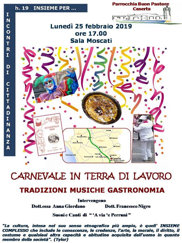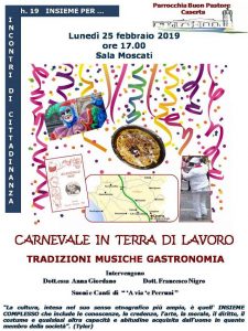 CASERTA – Lunedì 25 febbraio 2019, alle ore 17.00, presso la Parrocchia del Buon Pastore, Sala Moscati – Caserta, nell’ambito degli incontri mensili per la valorizzazione del territorio, dal titolo “Insieme per…”, si svolgerà un incontro sul tema del Carnevale in provincia di Caserta. Interverranno Anna Giordano, che porterà la sua preziosa testimonianza, ed il gruppo di musica popolare ‘A Via ‘e Perruni, gruppo musicale di San Nicola la Strada, che canterà le radici di Terra di Lavoro con riferimento alle tradizioni del Carnevale.
