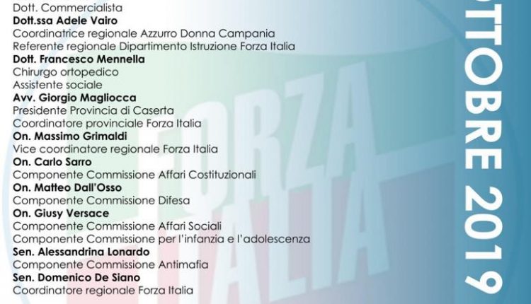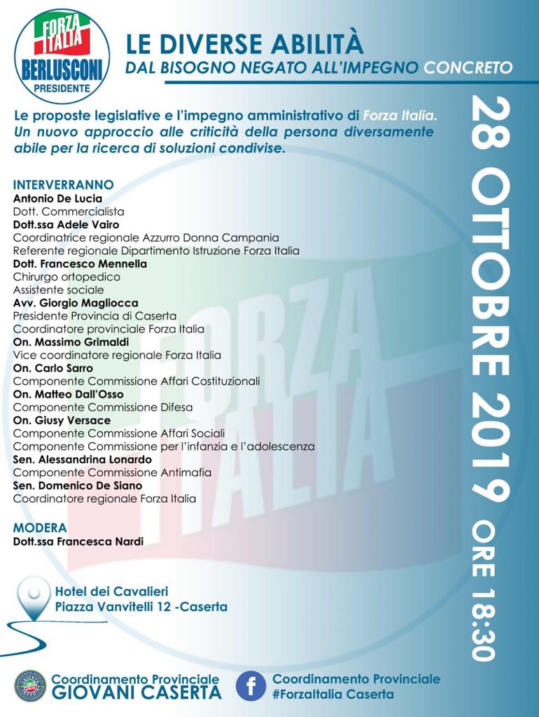 che in qualche modo permetta di socializzare i contenuti ed i metodi di intervento e soprattutto interpretare in modo condiviso quelli che sono i bisogni della nostra comunità locale. “Le diverse abilità, dal bisogno negato all’impegno concreto” è il tema del Convegno organizzato dal Coordinamento Provinciale di Forza, Su iniziativa dell’On. Carlo Sarro, che si è avvalso della collaborazione di stimati professionisti. Hanno partecipato e contribuito fattivamente alla realizzazione di questa iniziativa del Presidente Provinciale del partito azzurro oltre ai relatori, tra gli altri e non solo, Gabriele MAURIELLO, assistente parlamentare e membro attivo del coordinamento cittadino della città di Capua, Rosario FEOLA, Antonio GIUSTI, Presidente del Consiglio di Santa Maria la Fossa, Francesco BASILE, ex Consigliere Comunale di San Nicola la Strada, Eugenio RUSSO, Commissario Cittadino della città di Caserta, Antonio MEROLA, Melina RAGOZZINO, Consigliere Comunale e Coordinatrice Cittadina a Capua e Maria Teresa CHIANESE, che si terrà lunedì, 28 ottobre 2019, con inizio alle ore 18:30, presso Hotel Cavalieri sito in piazza Vanvitelli nr. 12 in Caserta. Al convegno interverranno come relatori: Antonio DE LUCIA, commercialista; Adele VAIRO, coordinatrice regionale Azzurro Donna Campania nonché referente regionale Dipartimento Istruzione FI; Francesco MENNELLA, chirurgo ortopedico assistente sociale; Giorgio MAGLIOCCA, Presidente Provincia e coordinatore provinciale FI; On. Massimo GRIMALDI, vice coordinatore regionale FI; On. Carlo SARRO, Componente Commissione Affari Istituzionali; On. Matteo DALL’OSSO, Componente Commissione Difesa; On. Giusy VERSACE, Componente Commissione a Affari Sociali e Componente Commissione per l’infanzia e l’adolescenza; Sen. Alessandrina LONARDO, Componente Commissione Antimafia; Sen. Domenico SIANO, Coordinatore regionale FI. A moderare gli interventi è stata chiamata la nota giornalista casertana Francesca NARDI.