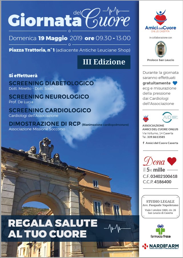 Come da prassi ormai consolidata, la “Giornata del Cuore” è giunta alla sua terza edizione. La manifestazione quest’anno sarà impreziosita dalla presenza di professionisti del settore diabetologico (dott.ssa Miretto e dott. Sodo) e neurologico (prof. De Lucia).