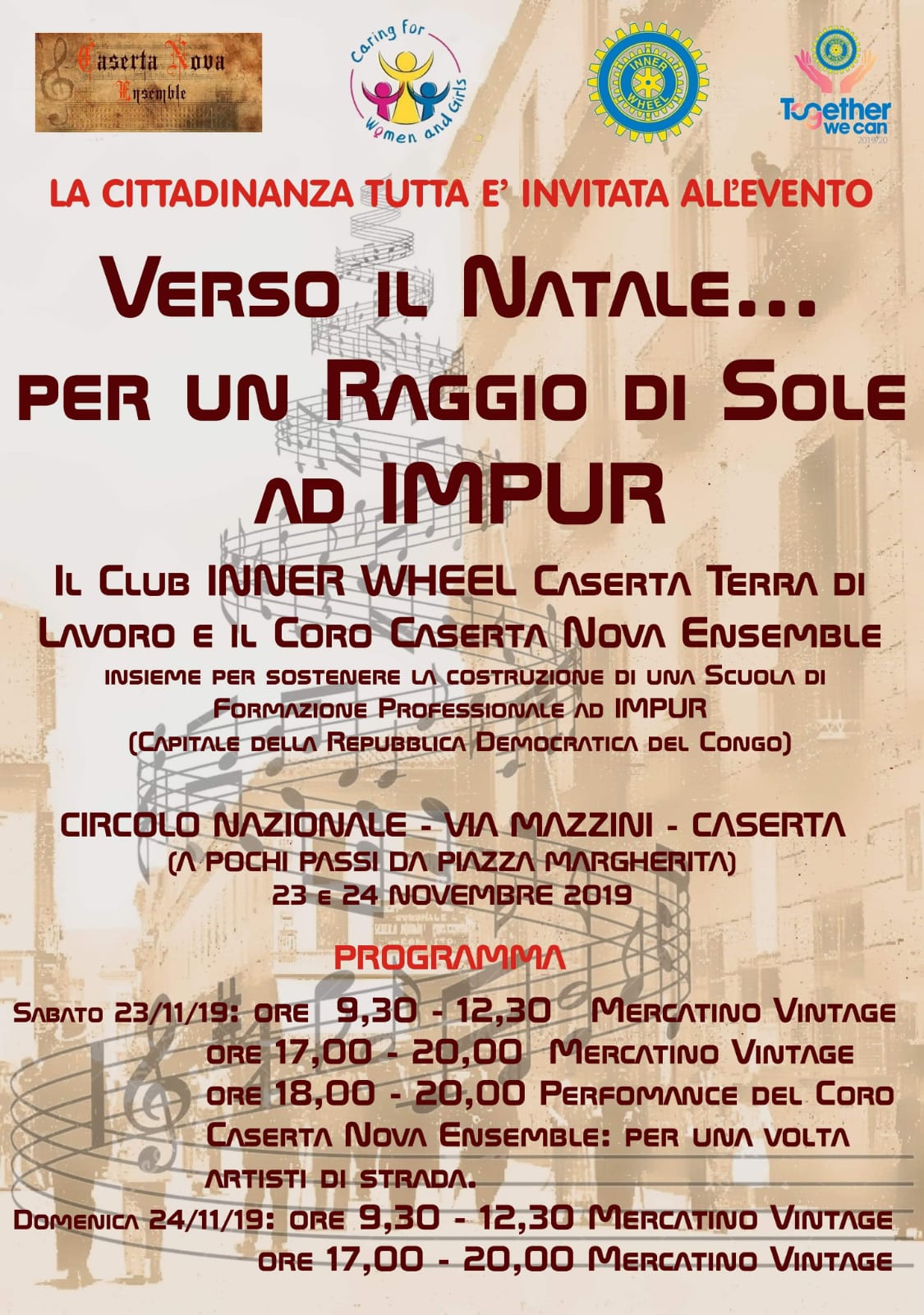 Questo fine settimana, grazie all’Inner Wheel, nel centro di Caserta si respirerà già aria natalizia per il mercatino di beneficenza organizzato. Lo scopo del mercatino sarà di devolvere il ricavato per la costruzione di una scuola di formazione nella Repubblica Democratica del Congo Nel mercatino vintage si potrà curiosare tra sciarpe, borse, bijoux, articoli per la casa è tanto altro. Tante idee per i primi regali natalizi coniugando l’acquisto ad uno scopo nobile e benefico. Il mercatino sarà in via Mazzini sabato e domenica sia di mattina che di pomeriggio fino alle 20.00. Non mancherà animazione ed esibizioni musicali ad allietare i partecipanti.