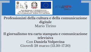 “In linea con la struttrura di questo percorso, che abbiamo inteso come una porta su un mondo – quello della comunicazione mediale – in rapida mutazione, anche il talk con Volpecina sarà l’occasione per discutere delle competenze, abilità e conoscenze di cui un giornalista deve essere dotato per comunicare a cavallo tra più media”, dichiara l’esperto Tirino. “Nello specifico, con Daniela, attraverso il racconto delle sue esperienze professionali, faremo un viaggio tra vari contesti in cui si è cimentata, passando dalla realtà del giornalismo locale casertano degli anni Novanta, fino agli studi televisivi della trasmissione ‘Tagadà’ di La 7 con cui collabora regolarmente, passando per gli scenari di guerra in cui ha lavorato”, conclude il docente dell’Ateneo salernitano.