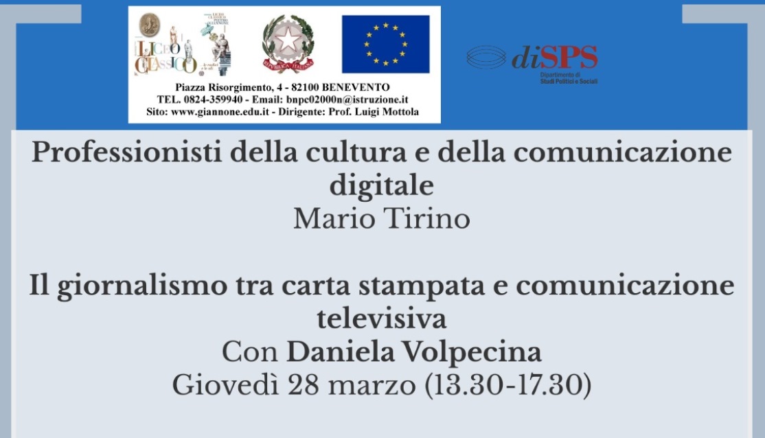 BENEVENTO – Chiusura con un appuntamento di elevato profilo per il percorso di alternanza scuola lavoro “Professionisti della cultura e della comunicazione digitale”, organizzato dal Liceo Classico “Pietro Giannone” di Benevento e dal Dipartimento di Studi Politici e Sociali dell’Università di Salerno. Sarà infatti la reporter Daniela Volpecina, giornalista del Mattino e di La 7, la protagonista dell’ultimo incontro delle attività, progettate e coordinate dal professor Mario Tirino, esperto esterno del percorso, studioso di culture digitali e assegnista di ricerca presso l’Ateneo salernitano.