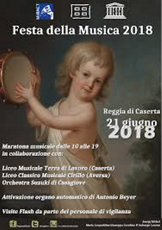 CASERTA – La Reggia partecipa alla Giornata della Musica il 21 giugno 2018, un’iniziativa promossa dal Ministero dei Beni e delle Attività Culturali e del Turismo che coinvolge più di 800 città e quasi 9.000 artisti in tutta Italia. Dalle ore 10.00 alle 19.00 il Palazzo Reale sarà ravvivato dalle performance dei giovani talenti del Liceo Musicale “Terra di Lavoro” di Caserta, del Liceo Classico Musicale “Cirillo” di Aversa e dell’Orchestra “Suzuki” di Casagiove, che eseguiranno un repertorio di brani dalla musica barocca al contemporaneo. L’attrazione della giornata sarà l’attivazione nelle Retrostanze dell’organo automatico di Anton Beyer