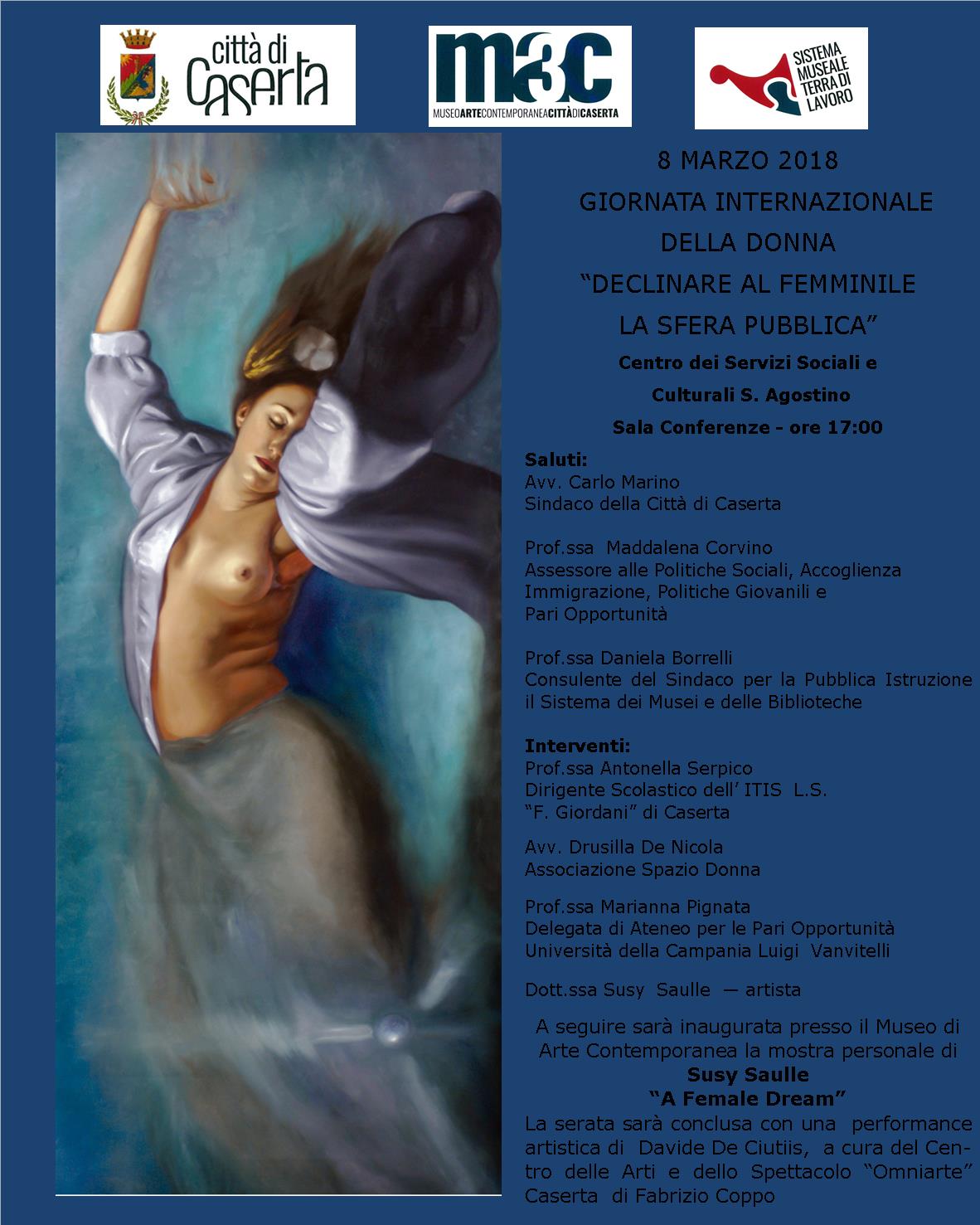 A seguire, presso la sede del Museo Comunale di Arte Contemporanea (MAC3), ci sarà l’inaugurazione della mostra personale della pittrice e restauratrice campana Susy Saulle, intitolata “A female dream”. La serata sarà conclusa da una performance artistica di Davide De Ciutiis, a cura del Centro delle Arti e dello Spettacolo “Omniarte” di Caserta di Fabrizio Coppo.