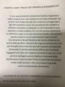 “In una specie di delirio consumista Caserta s’appresta a veder sorgere in un area ristretta di circa due chilometri tre grandi- medi supermercati – scrive l’Associazione – che s’andranno ad aggiungere agli altri presenti in zona. Un’operazione che modifica la struttura urbanistica, mettendo in crisi il concetto di aree deputate a verde pubblico, F3 ( area del piano regolatore del Comune di Caserta destinata al verde pubblico), ma che assesta soprattutto un definitivo colpo al piccolo commercio locale.”